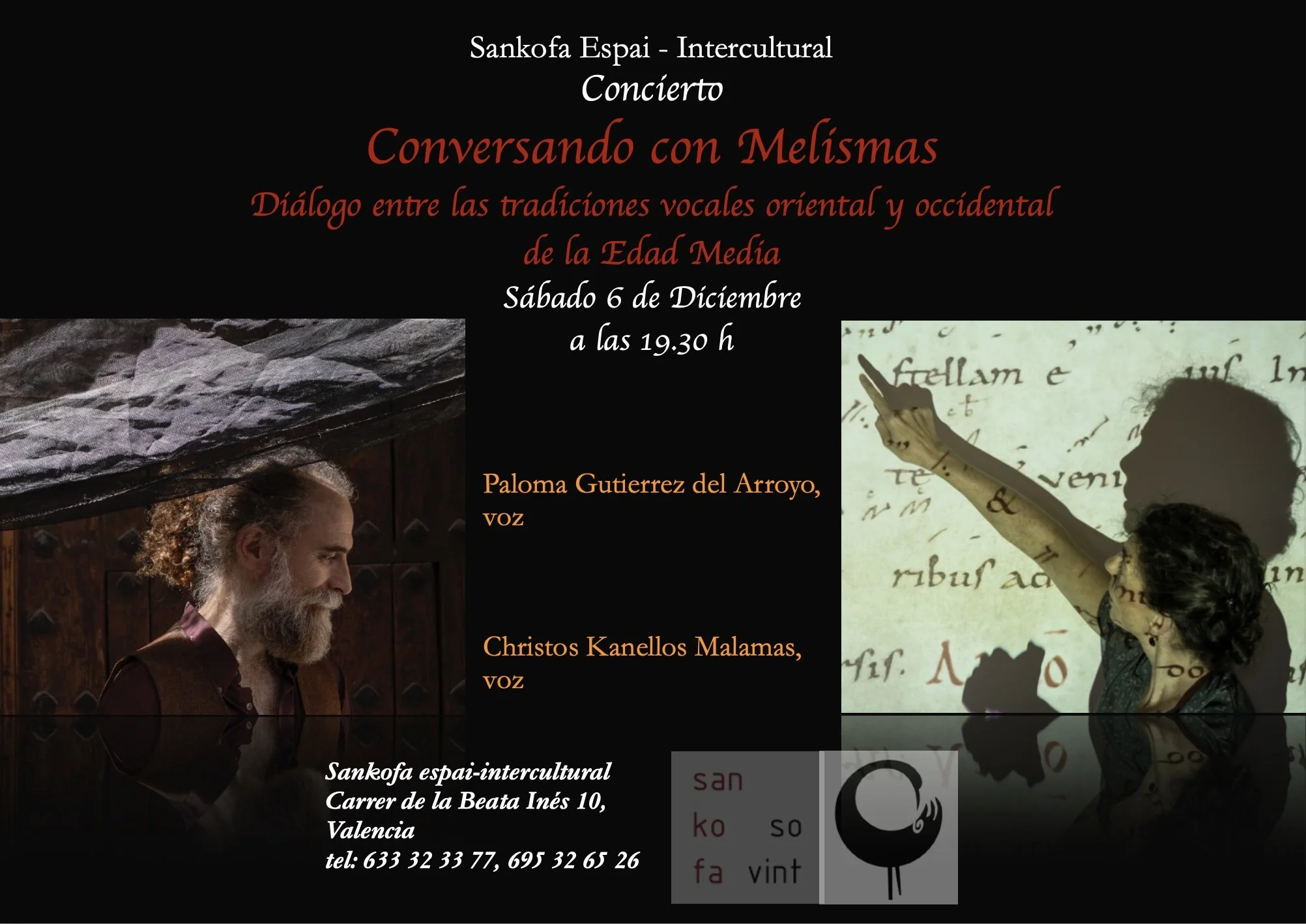 5th December 2025, 18h30. Sankofa Espai-Intercultural, Valencia, practical talks by Christos Kanellos and Paloma Gutiérrez del Arroyo “Conversando con melismas” about Gregorian and Byzantine chants.